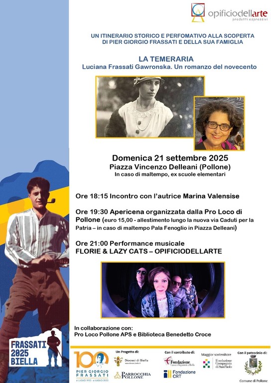 La giornata si aprirà alle 18:15 in Piazza Vincenzo Delleani con l’incontro con la scrittrice Marina Valensise, che presenterà il volume “La Temeraria. Luciana Frassati Gawronska – Un romanzo del Novecento”. Il libro restituisce la figura di una donna straordinaria, sorella di Pier Giorgio, capace di scelte ardite e di grande indipendenza intellettuale, protagonista di un secolo complesso e affascinante.