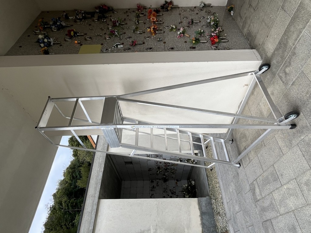 L’intervento ha previsto la fornitura di diverse tipologie di scale, con altezze calibrate per i vari padiglioni del cimitero, così da consentire l’accesso in sicurezza anche ai loculi posti nei livelli più alti.
