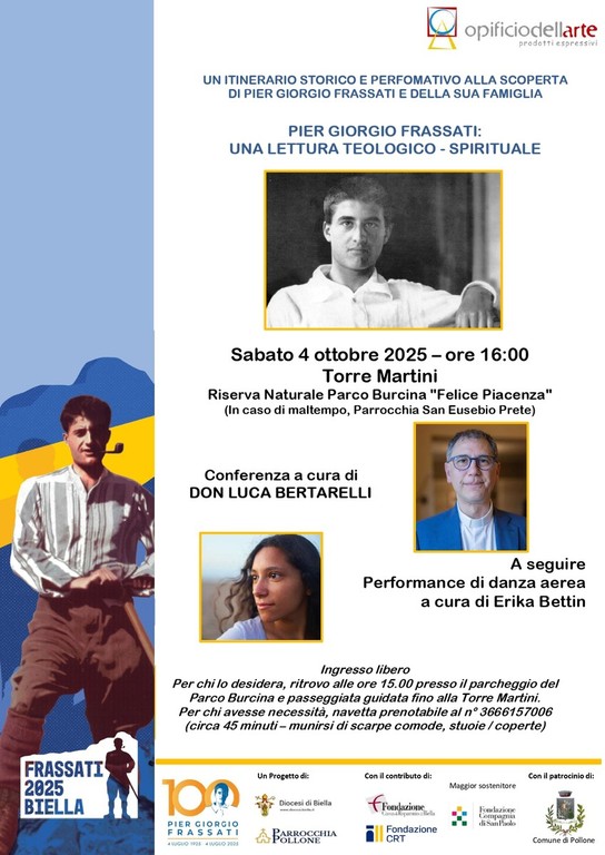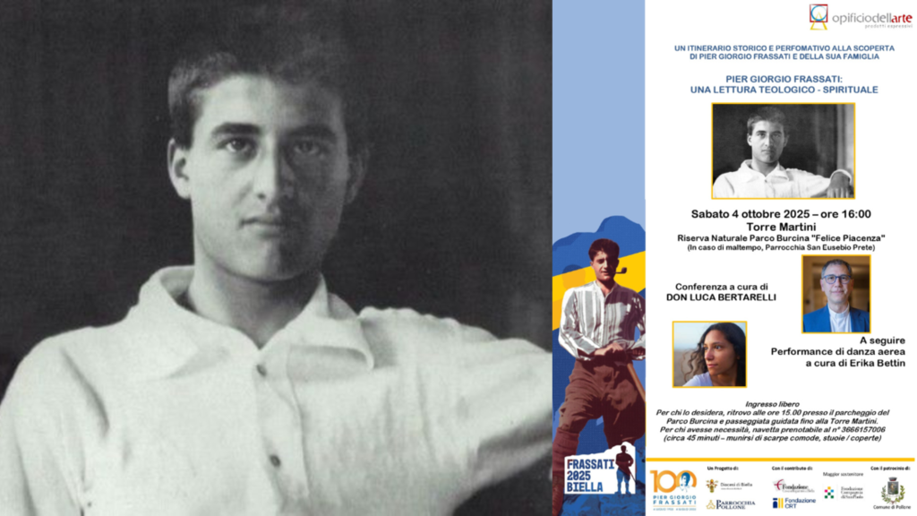 Prosegue il calendario di eventi dedicati alla figura di Pier Giorgio Frassati, nell’ambito del progetto Frassati 2025 – Biella. Sabato 4 ottobre 2025, alle ore 16, presso la Torre Martini nella Riserva Naturale del Parco Burcina “Felice Piacenza”, si terrà un incontro dal titolo “Pier Giorgio Frassati: una lettura teologico-spirituale”.