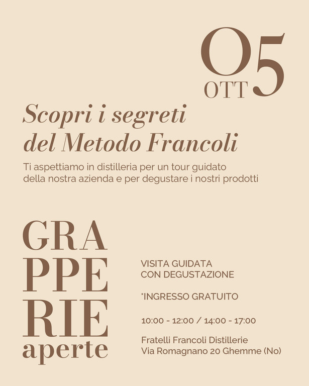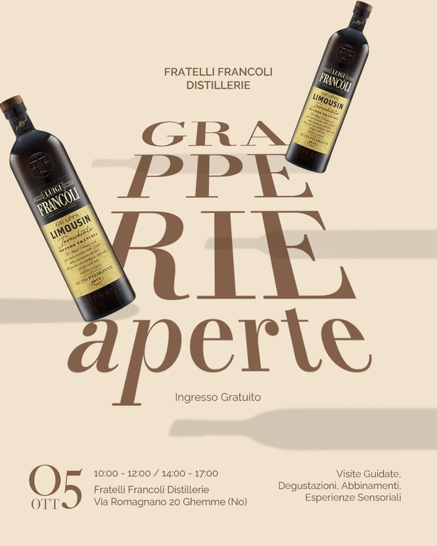 Domenica 5 ottobre torna Grapperie Aperte e anche quest’anno la storica Fratelli Francoli Distillerie di Ghemme (NO) sarà protagonista con l’evento speciale Piemonte Grappa, alla Corte dell’Alambicco. Una giornata gratuita interamente dedicata alla scoperta della Grappa, il distillato di bandiera italiano, che da sempre rappresenta identità, cultura e innovazione.