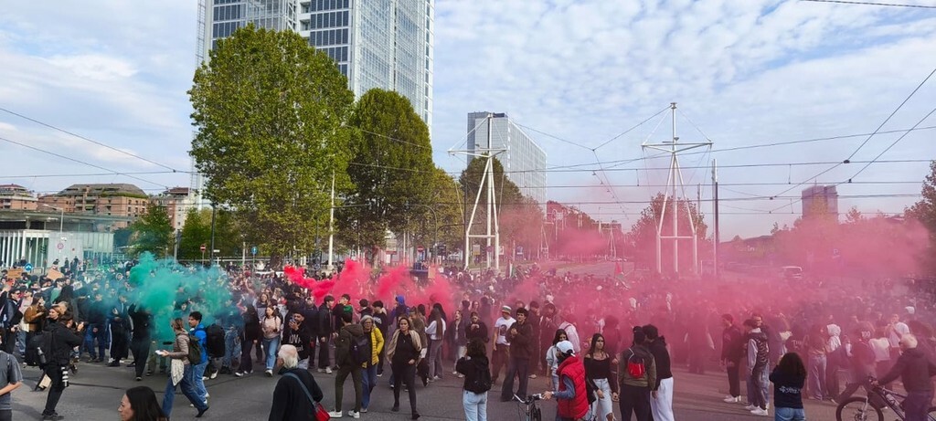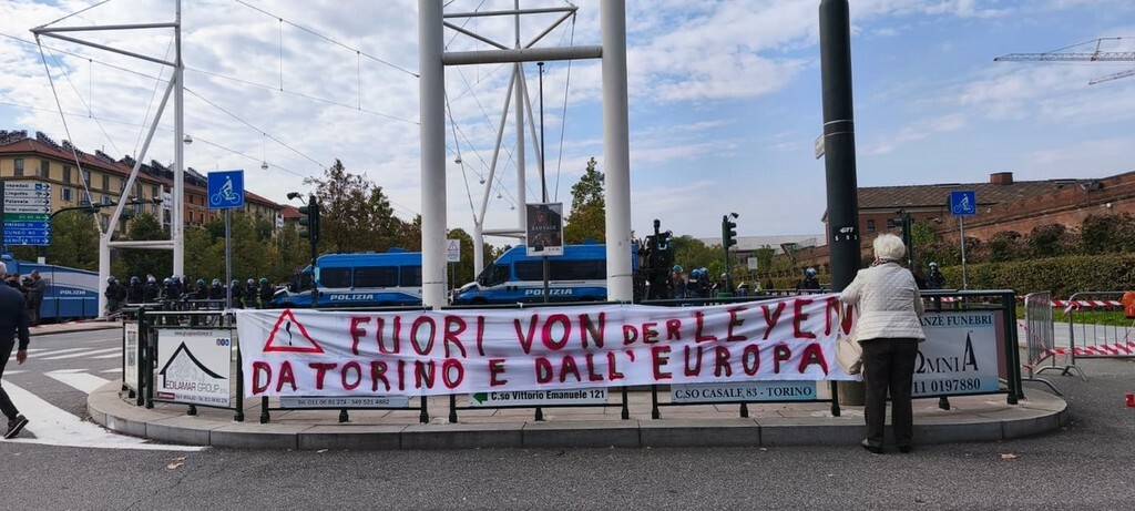 Mentre in città si radunano migliaia di persone di fronte al Comune, per la prima manifestazione della giornata di sciopero generale per Gaza e la Flotilla, in corso Vittorio parte il distaccamento che andrà a contestare la presenza di Jeff Bezos, Ursula Von Der Leyen, John Elkann e l'azienda Leonardo alla Tech Week.