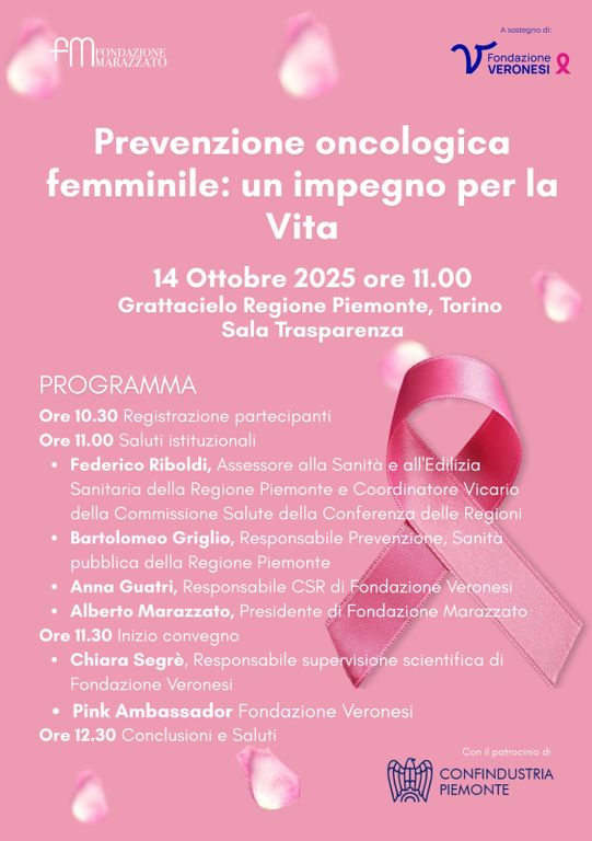SI TERRÀ IL PROSSIMO 14 OTTOBRE PRESSO IL GRATTACIELO DELLA REGIONE PIEMONTE A TORINO L’EVENTO DIVULGATIVO ORGANIZZATO DA FONDAZIONE MARAZZATO E FONDAZIONE UMBERTO VERONESI PER IL SOSTEGNO ALLA RICERCA CONTRO I TUMORI FEMMINILI