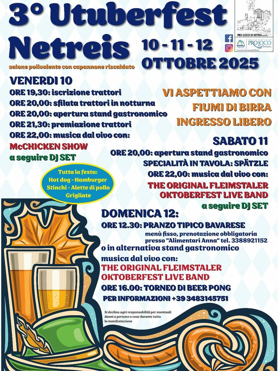 Si alza il sipario sulla 3ª edizione della Utuberfest di Netreis, l’evento autunnale più atteso della stagione in Valle Elvo. L’appuntamento è per il 10, 11 e 12 ottobre 2025, con tre giornate di festa tra musica dal vivo, cucina tipica, birra a fiumi e tanto divertimento.