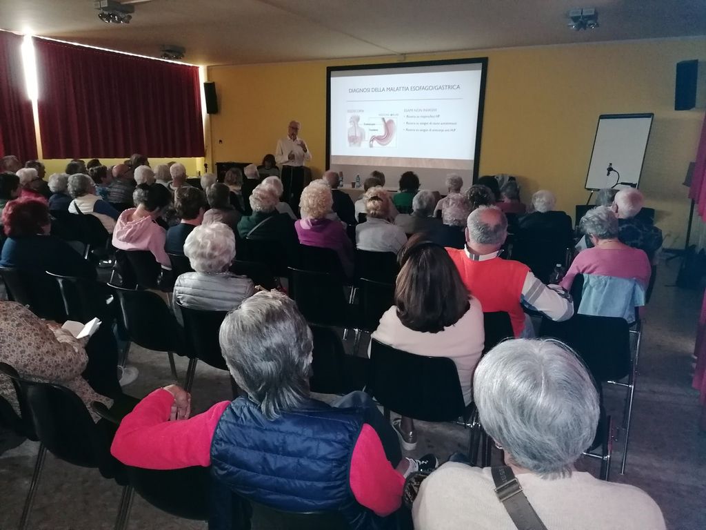 Il dr Ferrero ha iniziato parlando di reflusso gastroesofageo e gastrite, spiegando le differenze e la sintomatologia di entrambe le patologie riportando i farmaci da utilizzare con la precisazione di fare sempre un bilancio tra rischi e benefici. La dr.ssa Cum è successivamente intervenuta per relazionare sugli aspetti dietologici cominciando dalla valutazione del peso corporeo e dal calcolo del BMI (indice di massa corporea che mette in relazione il peso di una persona con la sua altezza per avere un indice dello stato nutrizionale) necessario per valutare se una persona è normopeso, sottopeso, sovrappeso od obeso. Per un'alimentazione corretta bisogna fare riferimento alla dieta mediterranea con la nuova piramide alimentare che parte dalla base costituita da frutta, verdure, acqua, olio extravergine, pane/pasta. frutta secca da consumare giornalmente.