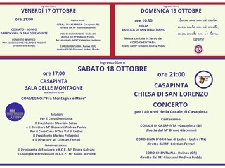 La giornata clou sarà quella di sabato 18 ottobre a Casapinta. Dalle 17, nella Sala delle Montagne della sede del Gruppo Alpini, si terrà il convegno “Fra montagna e mare – Canti corali in dialogo”, ideato e promosso dai cori ospiti con la collaborazione della Corale casapintese. All’incontro sarà presente, tra gli altri, il Presidente dell’Associazione Cori Piemontesi (A.C.P.) e di FENIARCO, M° Ettore Galvani. Alle 21, nella chiesa di San Lorenzo, in occasione del consueto Festival dei Cori, giunto quest’anno alla 36° edizione, si svolgerà il concerto per i 40 anni della Corale di Casapinta che vedrà come protagonisti i padroni di casa, diretti dal M° Bruno Giacomini, insieme al Coro Cima d’Oro Val di Ledro (TN), diretto dal M°Cristian Ferrari, e il Coro Ghentiana di Ruinas (OR), diretto dal M° Giovanni Andrea Puddu.