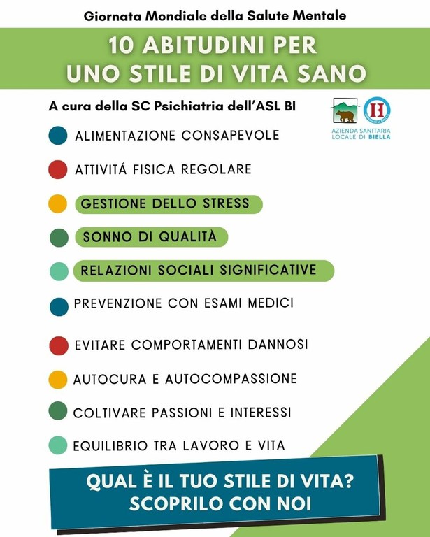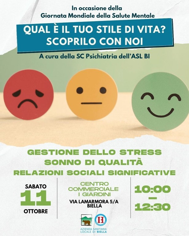 ● Nella mattina dell'11 ottobre, presso il Centro Commerciale I Giardini, dalle ore 10 alle 12.30. Sarà possibile confrontarsi con il personale dell’ASL BI e valutare la propria capacità di gestione dello stress, la qualità del sonno e il tipo di relazioni sociali che si intrattengono.