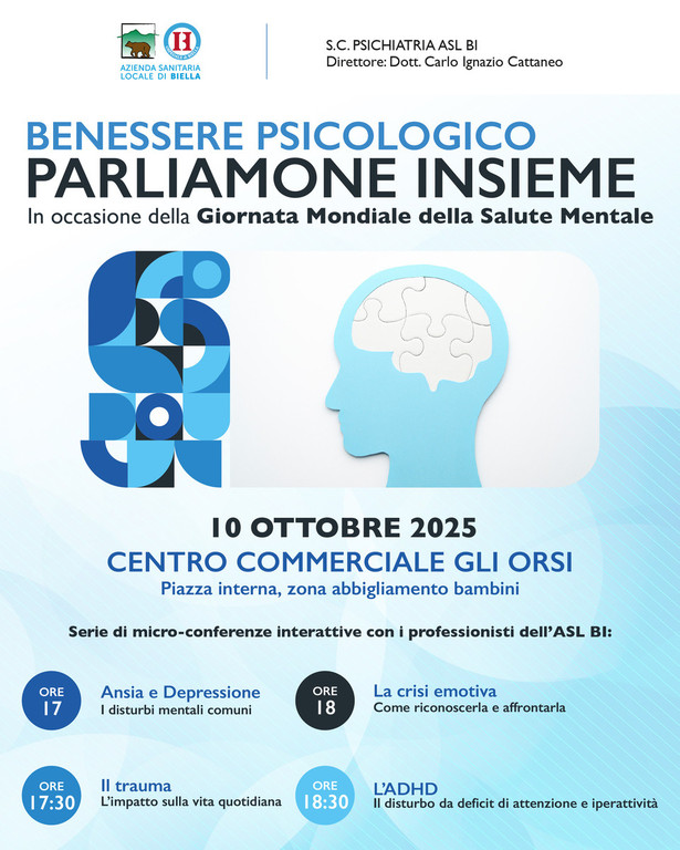 Il 10 ottobre ricorre la Giornata Mondiale della Salute Mentale e lo staff della S.C. Psichiatria dell’ASL di Biella, diretta dal dott. Carlo Ignazio Cattaneo, ha organizzato due iniziative rivolte alla cittadinanza nelle giornate di venerdì 10 e sabato 11 ottobre rispettivamente presso il Centro Commerciale “Gli Orsi” e presso il Centro Commerciale "I Giardini" di Biella.