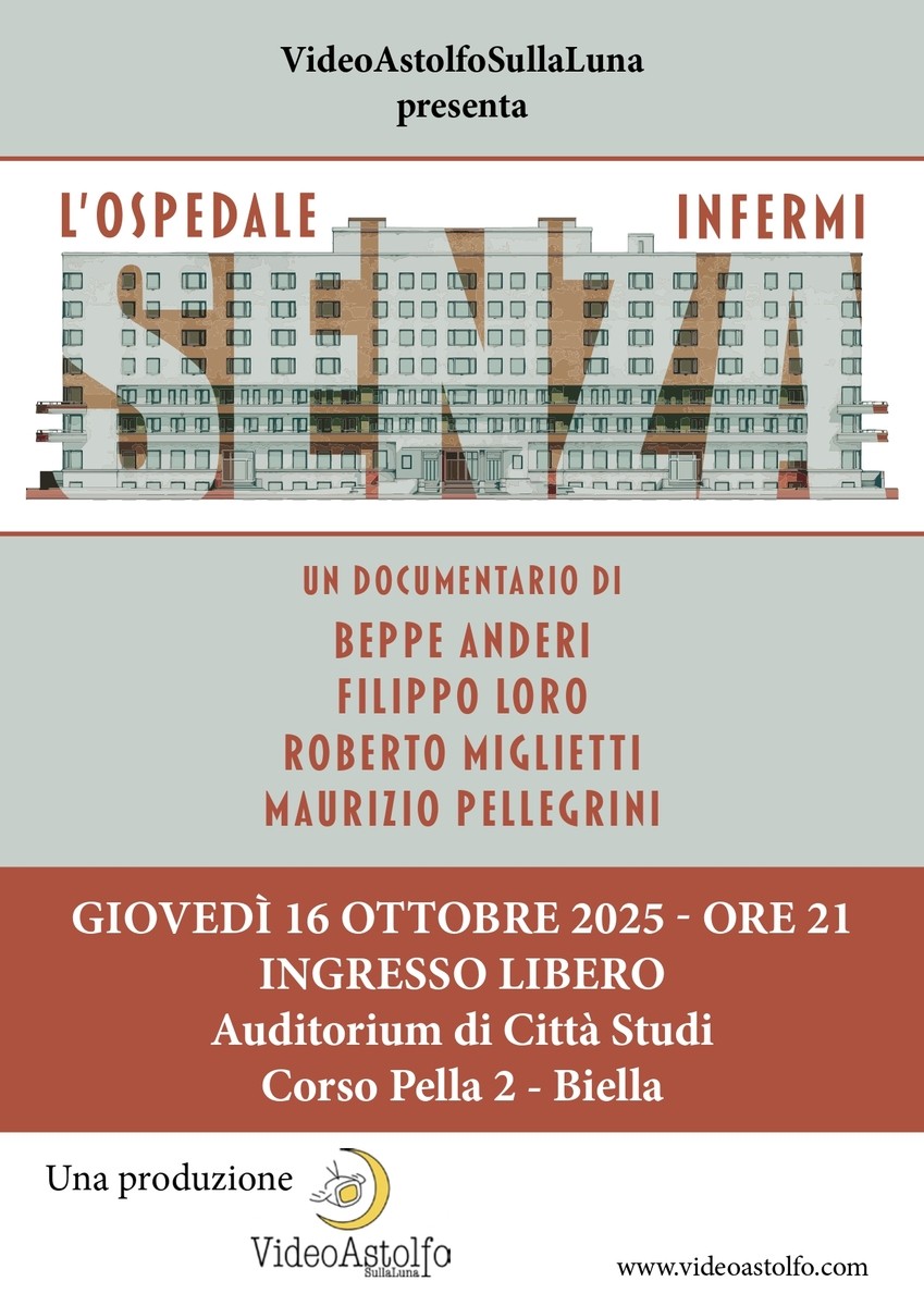 Giovedì 16 ottobre 2025 alle ore 21, presso l’Auditorium di Città Studi (Corso Pella 2, Biella), avrà luogo la prima proiezione del film L’Ospedale senza Infermi, prodotto da VideoAstolfoSullaLuna e diretto da Beppe Anderi, Filippo Loro, Roberto Miglietti e Maurizio Pellegrini.