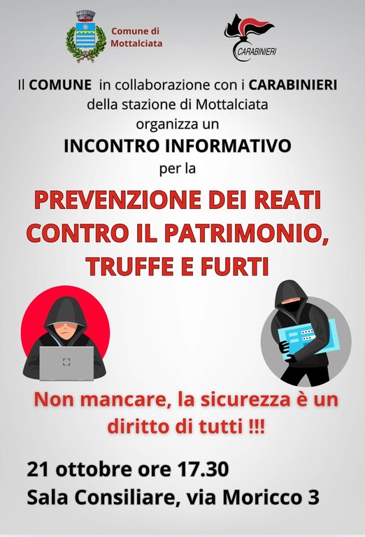 Si comunica che lunedì 21 ottobre, con inizio alle 17.30, presso la Sala Consiliare di Mottalciata, in via Moricco n. 3, si terrà un incontro pubblico interamente dedicato alla sicurezza. L'appuntamento vedrà la partecipazione del Comandante della Stazione dei Carabinieri di Mottalciata, il quale sarà a disposizione della popolazione per affrontare, in particolare, il tema della prevenzione dei reati contro il patrimonio.