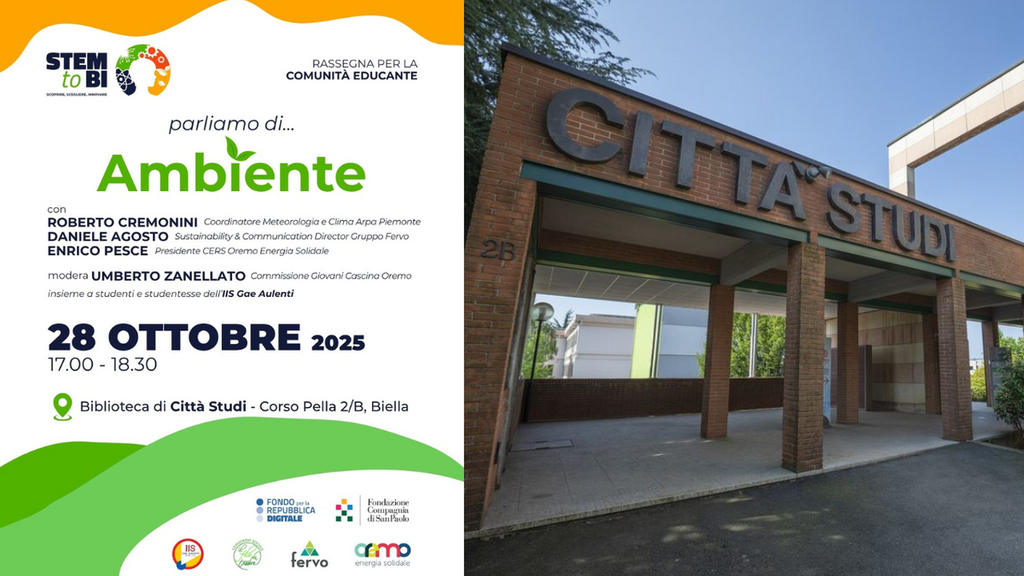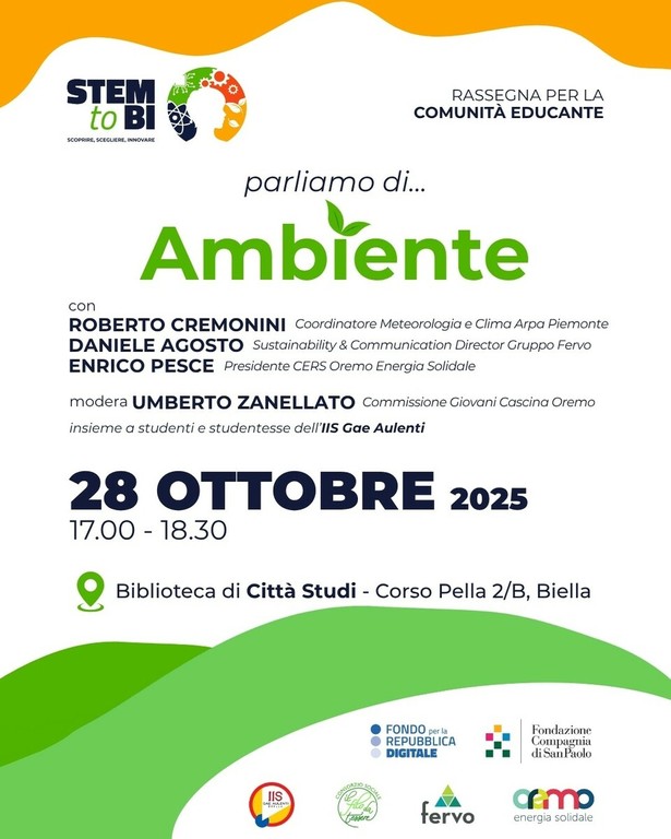 Nell’ambito della rassegna “STEM to BI – Scoprire, Scegliere, Innovare”, dedicata alla comunità educante, si terrà martedì 28 ottobre 2025, dalle 17.00 alle 18.30, presso la Biblioteca di Città Studi (Corso Pella 2/B, Biella) l’incontro pubblico “Parliamo di... Ambiente”.