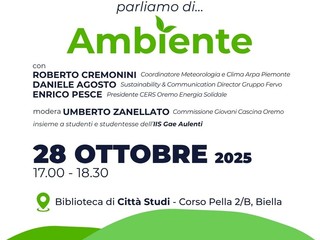 Nell’ambito della rassegna “STEM to BI – Scoprire, Scegliere, Innovare”, dedicata alla comunità educante, si terrà martedì 28 ottobre 2025, dalle 17.00 alle 18.30, presso la Biblioteca di Città Studi (Corso Pella 2/B, Biella) l’incontro pubblico “Parliamo di... Ambiente”.