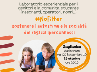 Il secondo appuntamento, “#NoFilter – Sostenere l’autostima e la socialità dei ragazzi iperconnessi”, è previsto per sabato 25 ottobre 2025 alle ore 10:15 presso l’Auditorium di Gaglianico, in via XX Settembre 10.