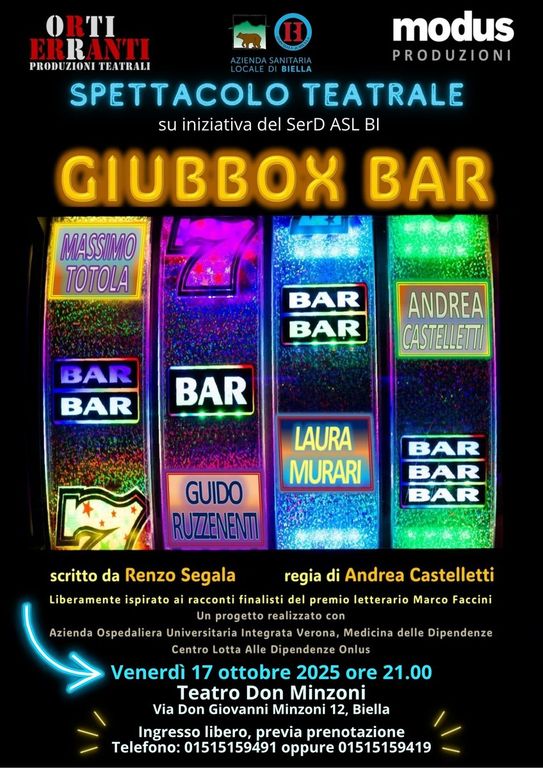 Il Dipartimento Interaziendale Patologia delle Dipendenze - SER.D., diretto dal Dott. Lorenzo Somaini, ha promosso l’organizzazione di “Giubbox Bar”, spettacolo teatrale che andrà in scena venerdì 17 ottobre, alle 21, presso il Teatro Don Minzoni, a Biella in via Don Minzoni 12.