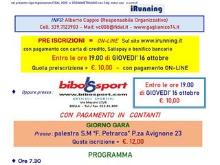 Si tratta di una corsa su strada agonistica nazionale BRONZE, valida come Prova Unica del Campionato Regionale FIDAL 2025 di Corsa su Strada Individuale e di Società, oltre che come prova del circuito Corripiemonte – Strada e Trofeo FIDAL Piemonte. Categorie ammesse: Allievi/e, Junior, Senior, Senior 35+, Runcard/FIDAL. Programma: Ore 7:30: ritrovo, apertura iscrizioni, consegna pettorali e pacchi gara presso la palestra della Scuola Media “F. Petrarca”. Ore 9:30: 1ª partenza (categorie da Allievi a SM55) – tempo massimo 45 minuti Ore 10:15: 2ª partenza (categorie SM60 e successive / Donne da Allieve in poi) – tempo massimo 50 minuti Ore 11:00 circa: premiazioni assoluti M/F, a seguire categorie, campioni regionali e premi speciali. Iscrizioni: Pre-iscrizioni online sul sito www.irunning.it (pagamento con carta, Satispay o bonifico) entro le ore 19:00 di giovedì 16 ottobre – quota €10.. È possibile iscriversi anche di persona presso “Bibo sport” entro la stessa scadenza (quota €10). Iscrizione in giornata presso la palestra “F. Petrarca”, P.za Avignone 23, con quota di €12. Info: Alberto Cappio (Responsabile Organizzativo) – Cell. 339 7123903 – Email: vc008@fidal.it – Sito: www.gaglianico74.it
