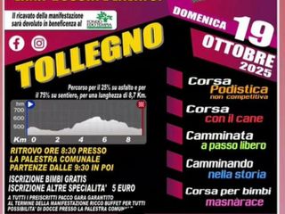 Corsa podistica non competitiva di 8,2 km; Ritrovo ore 8:30 presso la palestra comunale; Partenza ore 10:00; Quota iscrizione: €5 (gratuita per atleti sotto i 12 anni); Al tollegnese più veloce sarà assegnato il Trofeo “Gatto d’Oro”. La manifestazione si svolgerà con ogni condizione meteo. Chiusura preiscrizioni: ore 23:00 di sabato 18 ottobre