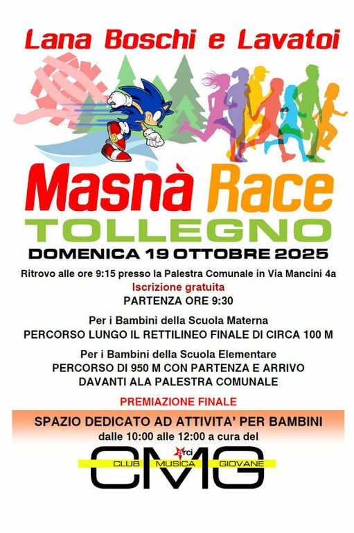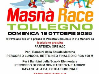 “Masnà Race” Ritrovo ore 9:15 presso la palestra comunale; Partenza ore 9:30. Iscrizione gratuita Percorsi: Scuola Materna: 100 m sul rettilineo finale; Scuola Elementare: 950 m (partenza e arrivo davanti alla palestra comunale). Premiazione finale e attività per bambini dalle ore 10:00 alle 12:00, a cura del Club Musica Giovane