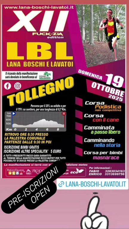 Sempre domenica 19 ottobre, a Tollegno si terrà la XII edizione della “Lana, Boschi e Lavatoi”, una giornata di sport e socialità con diverse iniziative per tutte le età.