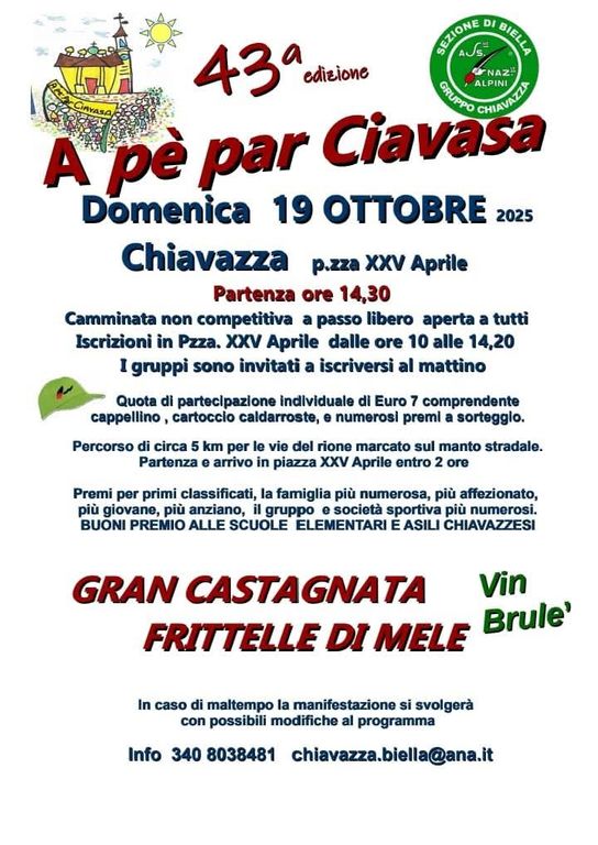 Domenica 19 a Biella Chiavazza ci sarà anche la "A pè par Ciavasa", alla 43° edizione. L'appuntamento proposto come da tradizione dal Gruppo Alpini è in p.zza XXV Aprile. La partenza è alle ore 14,30 della camminata non competitiva a passo libero aperta a tutti. Le iscrizioni si raccoglieranno in Pzza. XXV Aprile dalle ore 10 alle 14,20. I gruppi sono invitati a iscriversi al mattino. La quota di partecipazione individuale di Euro 7 che comprende cartoccio caldarroste, medaglione ricordo e numerosi premi a sorteggio.