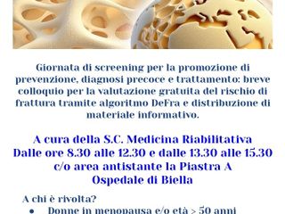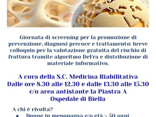 Lunedì 20 ottobre 2025, in occasione della Giornata Mondiale dell’Osteoporosi, la S.C. Medicina Riabilitativa dell’ASL di Biella, diretta dalla Dott.ssa Lia Rusca, ha organizzato un’iniziativa legata alla prevenzione dell’osteoporosi, patologia che colpisce almeno 5 milioni di persone in Italia.