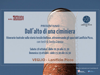 Un percorso tra memoria e teatro si prepara ad animare gli spazi del Lanificio Picco di Veglio. Sabato 18 e domenica 19 ottobre andrà in scena “Dall’alto di una ciminiera”, un nuovo itinerario teatrale firmato dalla compagnia Teatrando, diretta da Paolo Zanone, in collaborazione con lo storico e archivista Danilo Craveia.
