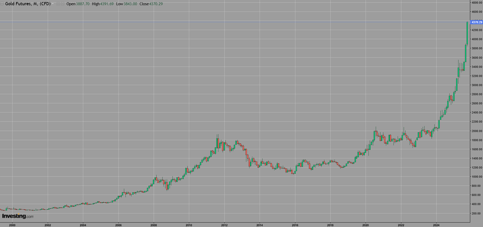 Oggi, dopo che negli ultimi mesi il metallo giallo ha messo a segno una performance straordinaria (più del 60% da inizio anno) siamo quasi ad un valore di 4.400 USD l’oncia.
