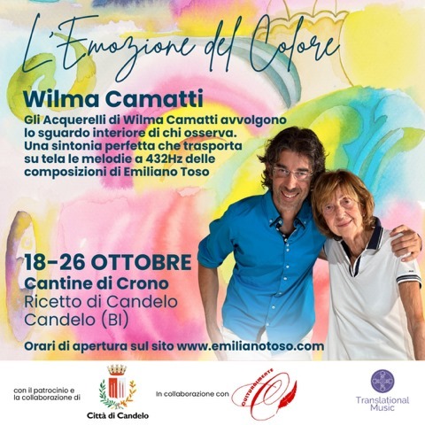 Dal 18 al 26 ottobre, le Cantine di Crono ospiteranno invece la mostra “L’Emozione del Colore” di Wilma Camatti, realizzata in collaborazione con Emiliano Toso. L’esposizione propone un dialogo tra gli acquerelli dell’artista e le melodie del musicista, accordate a 432 Hz, in una relazione tra segno e suono.