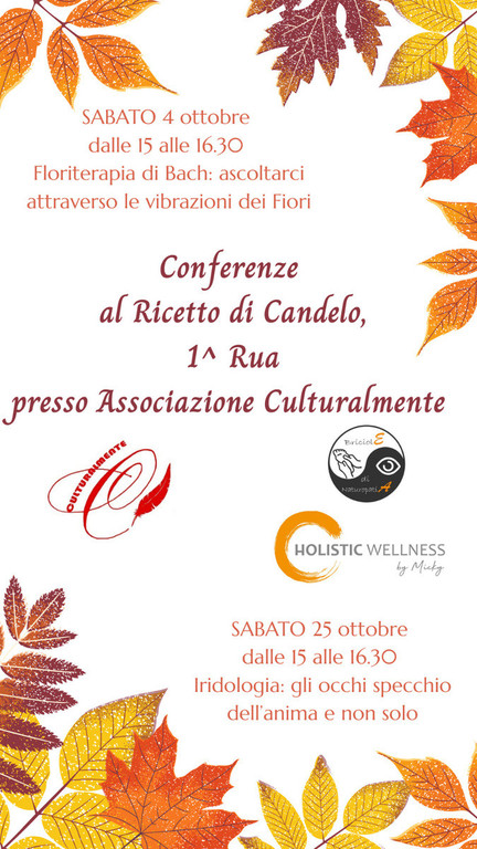 Il calendario si apre sabato 4 ottobre, dalle 15 alle 16.30, con l’incontro “Floriterapia di Bach: ascoltarci attraverso le vibrazioni dei Fiori”, un approfondimento dedicato all’approccio naturale della floriterapia.