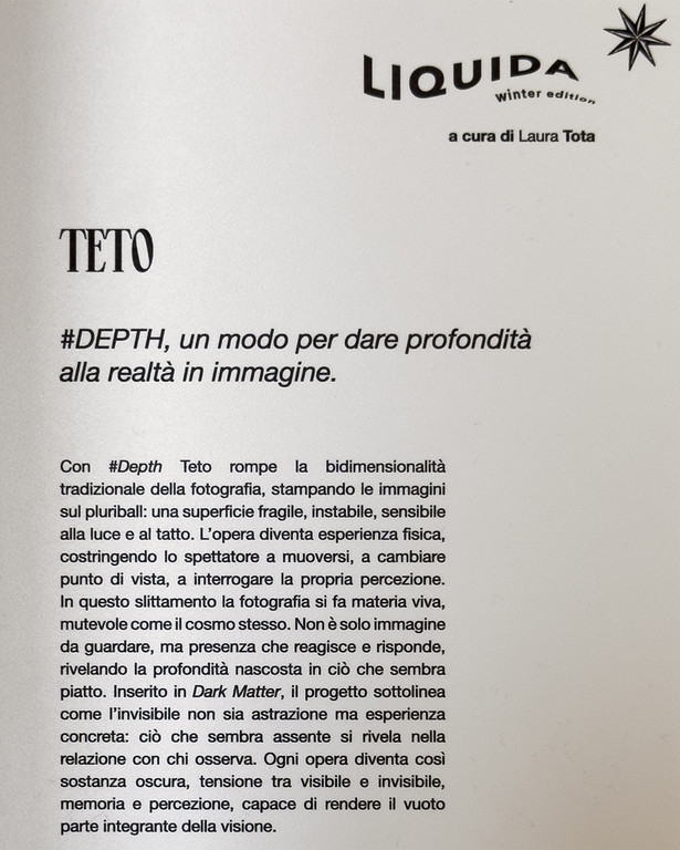 "Con #DEPTH Stefano Ceretti (“Teto” lo pseudonimo usato a Paratissima) rompe la bidimensionalità tradizionale della fotografia, stampando le immagini su pluriball: una superficie fragile, instabile, sensibile alla luce e al tatto - spiega la curatrice Laura Tota - . L’opera diventa esperienza fisica, costringendo lo spettatore a muoversi, a cambiare punto di vista, a interrogare la propria percezione. In questo slittamento la fotografia si fa materia viva, mutevole come il cosmo stesso. Non è solo immagine da guardare, ma presenza che reagisce e risponde, rivelando la profondità nascosta in ciò che sembra piatto. Inserito in Dark Matter, il progetto sottolinea come l’invisibile non sia astrazione ma esperienza concreta: ciò che sembra assente si rivela nella relazione con chi osserva. Ogni opera diventa così sostanza oscura, tensione tra visibile e invisibile, memoria e percezione, capace di rendere il vuoto parte integrante della visione".