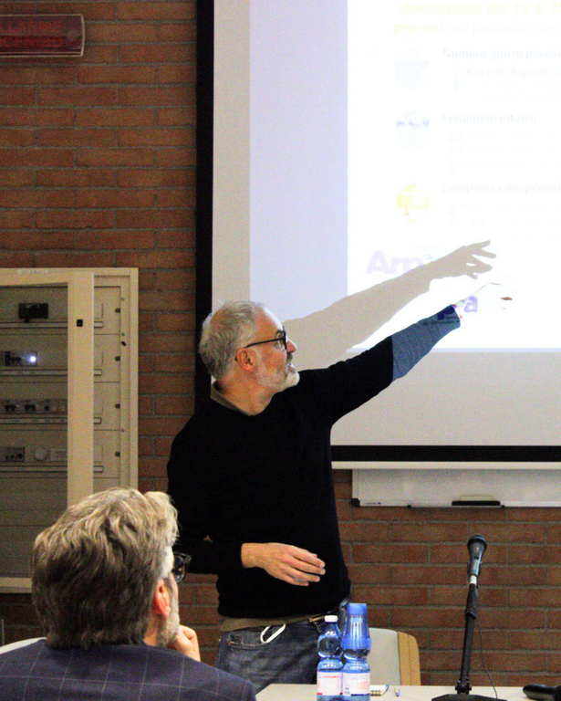 Roberto Cremonini, di ARPA Piemonte, ha aperto l’incontro portando dati e scenari concreti sul cambiamento climatico. Ha ricordato che la serie storica dei dati meteorologici raccolti da ARPA, che in Piemonte parte dalla metà del Settecento grazie alle osservazioni torinesi, rappresenta oggi una base scientifica preziosa per comprendere l’evoluzione del clima regionale. Cremonini ha illustrato come anche nel Biellese si osservino tendenze simili: piove mediamente meno, ma con eventi più intensi, con effetti sulla disponibilità di acqua e sull’aumento dei periodi di siccità. Ha evidenziato inoltre che le Alpi sono un hotspot climatico, tra le aree più sensibili ai cambiamenti, e che l’innalzamento delle temperature potrebbe favorire nuove coltivazioni anche in montagna. “Il cambiamento climatico – ha sottolineato – va osservato in tutte le sue sfumature, senza approssimazioni, e richiede un approccio basato su mitigazione e adattamento. Dobbiamo imparare a gestire ciò che non possiamo evitare e a evitare ciò che non possiamo gestire”.