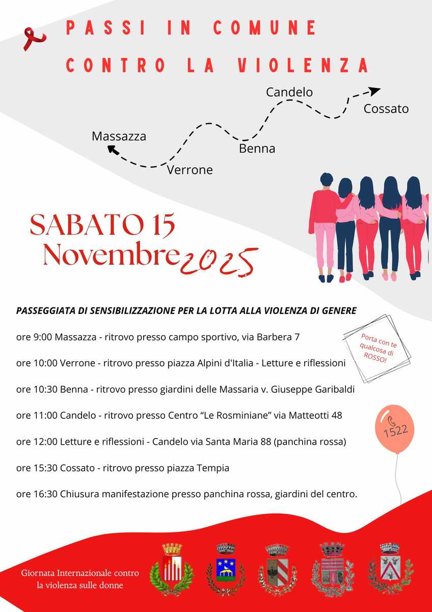 In occasione della Giornata internazionale per l’eliminazione della violenza contro le donne, sabato 15 novembre 2025 i cinque Comuni biellesi promuovono “Passi in Comune contro la violenza”, una passeggiata di sensibilizzazione aperta a tutta la cittadinanza.