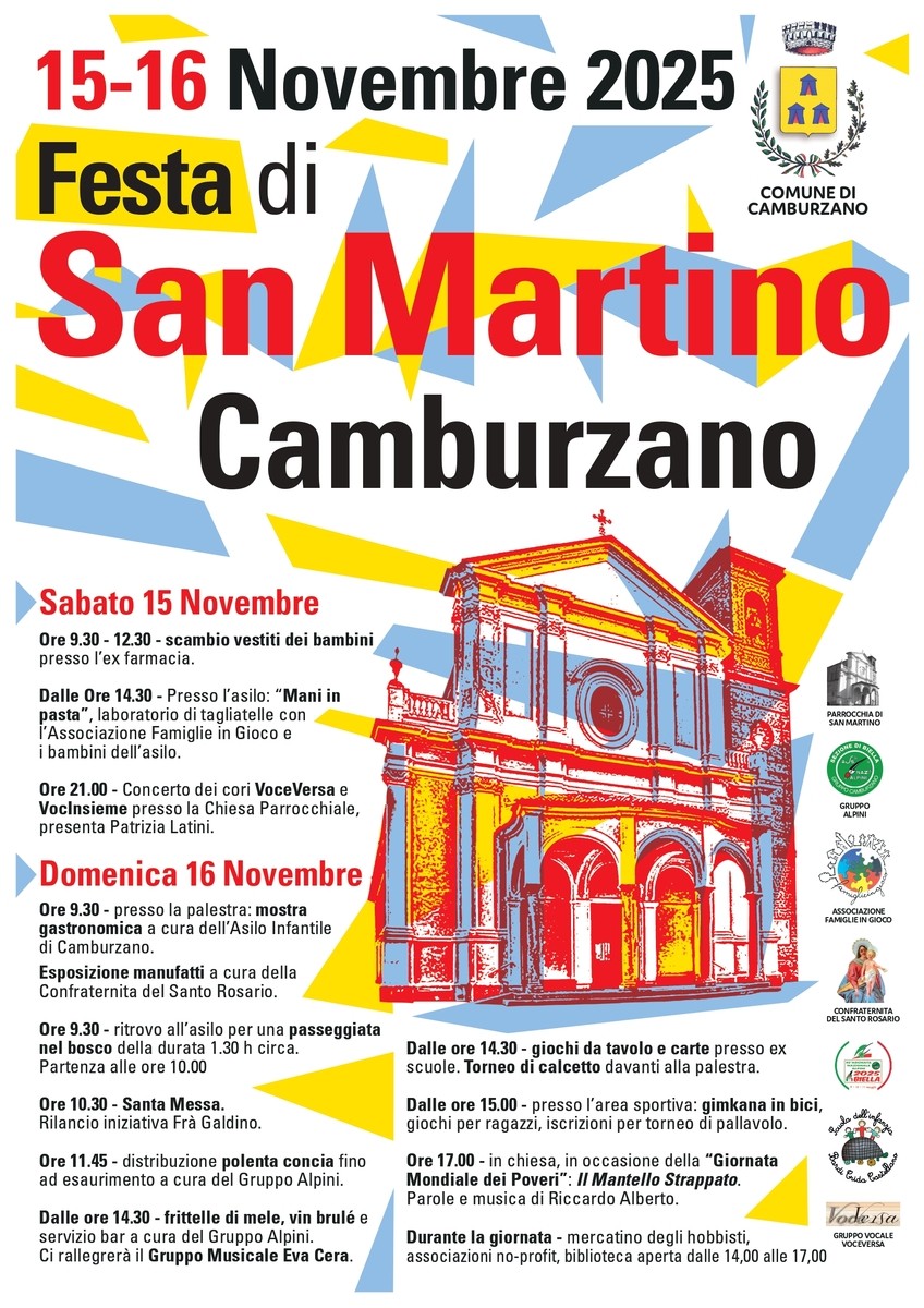 A Camburzano è tutto pronto per la Festa di San Martino, appuntamento che sabato 15 e domenica 16 novembre animerà il paese con un fitto programma di attività. La manifestazione è organizzata dal Comune di Camburzano insieme alla Parrocchia di San Martino, alla Confraternita del Santo Rosario, all’Associazione Famiglie in Gioco, al Gruppo Alpini e al Gruppo vocale VoceVersa, con il contributo di diverse realtà del territorio.