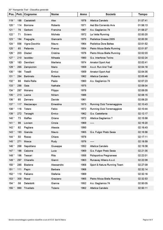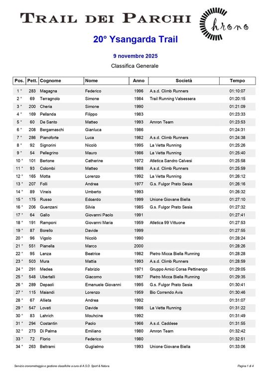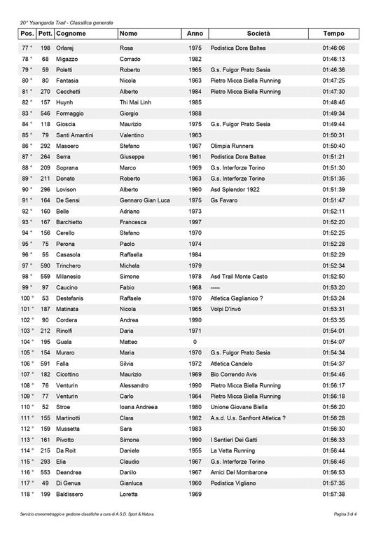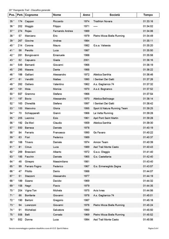 km 19 maschile 1° Magagna Federico (A.s.d. Climb Runners) 01:10:07, 2° Terragnolo Simone (Trail Running Valsessera) 01:20:15, 3° Cheria Simone 01:21:09, 4° Pellanda Filippo 01:23:33, 5° De Santo Matteo (Amron Team) 01:23:53, 6° Bergamaschi Gianluca 01:24:31, 7° Pianoforte Luca (A.s.d. Climb Runners) 01:24:38, 8° Signorini Nicolò (La Vetta Running) 01:25:26, 9° Pellegrino Mauro (La Vetta Running) 01:25:40, 10° Colombi Matteo (A.s.d. Climb Runners) 01:25:59, 11° Motta Lorenzo (La Vetta Running) 01:26:12, 12° Folli Andrea (G.s. Fulgor Prato Sesia) 01:26:16, 13° Vineis Umberto 01:26:32, 14° Russo Edoardo (Unione Giovane Biella) 01:27:10, 15° Gallo Giovanni Paolo 01:27:41, 16° Ramponi Giovanni Maria (Atletica 99 Vittuone) 01:27:53, 17° Borello Davide 01:27:55, 18° Vigolo Nicolò 01:28:24, 19° Pianella Marco 01:28:26, 20° Mura Mattia (A.s.d. Climb Runners) 01:28:59, 21° Medea Fabrizio (Gruppo Amici Corsa Pettinengo) 01:29:05, 22° Ubertalli Giacomo (Pietro Micca Biella Running) 01:29:35, 23° Depaoli Emanuele Giovanni (G.s. Fulgor Prato Sesia) 01:30:41, 24° Maiandi Lorenzo (Bio Correndo Avis) 01:30:46, 25° Allieta Andrea 01:31:07, 26° Lovati Davide (La Vetta Running) 01:31:22, 27° Lahrich Mouhcine 01:31:49, 28° Costantin Paolo (A.s.d. Caddese) 01:31:55, 29° Di Palma Emiliano (Amron Team) 01:32:42, 30° Florio Federico 01:32:51, 31° Beltrami Guglielmo (Unione Giovane Biella) 01:33:06, 32° Cappon Riccardo (Triathlon Novara) 01:33:16, 33° Moggio Filippo (-----) 01:34:02, 34° Rojas Fernando Andres 01:34:06, 35° Marciano Eric (Pietro Micca Biella Running) 01:34:49, 36° Giovine Andrea 01:35:11, 37° Corona Mauro (G.s.a. Valsesia) 01:35:20, 38° Perotto Luca 01:35:50, 39° Bongiovanni Emanuele 01:35:58, 40° Bernardi Giovanni 01:36:19, 41° Masera Dante 01:36:22, 42° Galliani Alessandro (Atletica Santhia) 01:36:46, 43° Venditti Matteo (I Sentieri Dei Gatti) 01:37:26, 44° Osiliero Valentino (A.s. Gaglianico 74) 01:37:32, 45° Gremmo Stefano 01:37:54, 46° Bovio Alessandro (Atletica Bellinzago) 01:38:14, 47° D'eredità Stefano (I Sentieri Dei Gatti) 01:38:42, 48° Schiapparelli Gianni (La Vetta Running) 01:39:28, 49° Leonino Ezio (Apd Pont Saint Martin) 01:39:28, 50° De Mori Claudio (Atletica Santhia) 01:39:30, 51° Barreca Daniele 01:40:19, 52° Ferraris Francesco (Gs Favaro) 01:40:22, 53° Fiori Federico 01:40:37, 54° Trivero Daniele (Amron Team) 01:40:39, 55° Cinus Luca (Asd Trail Monte Casto) 01:40:43, 56° Bresciani Alberto (G.a.o. Oleggio) 01:41:40, 57° Facchin Daniele (G.s. Castellania) 01:42:40, 58° Ginepro Massimiliano 01:43:40, 59° Ferraro Fogno Federico (G.s. Ermenegildo Zegna) 01:43:57, 60° Pilotto Denis 01:44:07, 61° Stazzoni Alessandro 01:44:19, 62° Sizano Davidw 01:44:32, 63° Negri Flavio 01:44:35, 64° Bonfante Giovanni (A.s. Gaglianico 74) 01:45:01, 65° Bertoni Gregorio 01:45:18, 66° Lorenzoni Giovanni (Pietro Micca Biella Running) 01:45:24, 67° Michelizzi Salvatore 01:45:50, 68° Belli Corrado (Pietro Micca Biella Running) 01:45:52, 69° Donna Luca (Asd Trail Monte Casto) 01:45:56, 70° Migazzo Corrado 01:46:13, 71° Poletti Roberto (G.s. Fulgor Prato Sesia) 01:46:36, 72° Fantasia Nicola (Pietro Micca Biella Running) 01:47:25, 73° Cecchetti Alberto (Pietro Micca Biella Running) 01:47:30, 74° Formaggio Giorgio 01:49:34, 75° Gioscia Maurizio (G.s. Fulgor Prato Sesia) 01:49:44, 76° Santi Amantini Valentino 01:50:31, 77° Masoero Stefano (Olimpia Runners) 01:50:40, 78° Serra Giuseppe (Podistica Dora Baltea) 01:51:21, 79° Soprana Marco (G.s. Interforze Torino) 01:51:30, 80° Donato Roberto (G.s. Interforze Torino) 01:51:35, 81° Lovison Alberto (Asd Splendor 1922) 01:51:39, 82° De Sensi Gennaro Gian Luca (Gs Favaro) 01:51:47, 83° Belle Adriano 01:52:11, 84° Cerello Stefano 01:52:25, 85° Perona Paolo 01:52:28, 86° Milanesio Simone (Asd Trail Monte Casto) 01:52:50, 87° Caucino Fabio (-----) 01:53:20, 88° Destefanis Raffaele (Atletica Gaglianico ? ) 01:53:24, 89° Matinata Nicola (Volpi D'invò) 01:53:31, 90° Cordera Andrea 01:53:35, 91° Guala Matteo 01:54:07, 92° Cicottino Maurizio (Bio Correndo Avis) 01:54:46, 93° Venturin Alessandro (Pietro Micca Biella Running) 01:56:17, 94° Venturin Carlo (Pietro Micca Biella Running) 01:56:18, 95° Pivotto Simone (I Sentieri Dei Gatti) 01:56:33, 96° Da Roit Daniele (La Vetta Running) 01:56:44, 97° Elia Claudio (G.s. Interforze Torino) 01:56:46, 98° Deandrea Danilo (Amici Del Mombarone) 01:56:53, 99° Di Genua Gianluca (Podistica Vigliano) 01:57:35, 100° Castaldelli Alex (Atletica Candelo) 01:57:41, 101° Borrione Roberto (Asd Bio Correndo Avis) 01:58:13, 102° Freguglia Giancarlo (Podistica Cressa 2005) 02:00:30, 103° Vigna Docchio Mauro (Podistica Dora Baltea) 02:01:52, 104° Pellanda Franco (Pietro Micca Biella Running) 02:01:57, 105° Zampicinini Mario (A.s.d. Run And Trail) 02:04:18, 106° Tosalli Enrico (Amatori Sport Asd) 02:04:35, 107° Barbirato Roberto (Atletica Candelo) 02:05:46, 108° Mello Rella Paolo (A.s. Gaglianico 74) 02:07:23, 109° Moirano Filippo 02:08:05, 110° Zennaro Davide 02:08:20, 111° Totaro Fabio (Running Club Torremaggiore) 02:10:44, 112° Terzaghi Enrico (G.s. Castellania) 02:12:17, 113° Gianola Mauro (G.s. Fulgor Prato Sesia) 02:16:56, 114° Mosca Rudy (-----) 02:18:59, 115° Napolitano Giuseppe (Atletica Candelo) 02:19:38, 116° Calzone Luca (G.s. Fulgor Prato Sesia) 02:21:35, 117° Chiarello Gianni (Runaway Milano A.s.d.) 02:22:09, 118° Biadene Alessandro (Sport & Natura Running Team) 02:27:09, 119° Rossi Graziano (Pietro Micca Biella Running) 02:32:53, 120° Trivellato Tiziano (Atletica Candelo) 02:50:11.