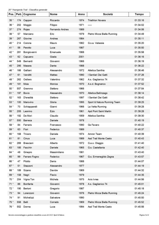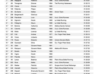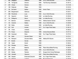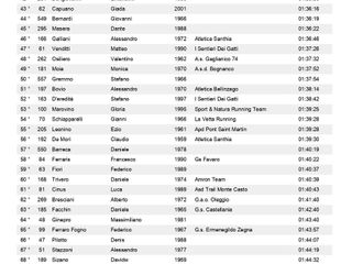 km 19 maschile 1° Magagna Federico (A.s.d. Climb Runners) 01:10:07, 2° Terragnolo Simone (Trail Running Valsessera) 01:20:15, 3° Cheria Simone 01:21:09, 4° Pellanda Filippo 01:23:33, 5° De Santo Matteo (Amron Team) 01:23:53, 6° Bergamaschi Gianluca 01:24:31, 7° Pianoforte Luca (A.s.d. Climb Runners) 01:24:38, 8° Signorini Nicolò (La Vetta Running) 01:25:26, 9° Pellegrino Mauro (La Vetta Running) 01:25:40, 10° Colombi Matteo (A.s.d. Climb Runners) 01:25:59, 11° Motta Lorenzo (La Vetta Running) 01:26:12, 12° Folli Andrea (G.s. Fulgor Prato Sesia) 01:26:16, 13° Vineis Umberto 01:26:32, 14° Russo Edoardo (Unione Giovane Biella) 01:27:10, 15° Gallo Giovanni Paolo 01:27:41, 16° Ramponi Giovanni Maria (Atletica 99 Vittuone) 01:27:53, 17° Borello Davide 01:27:55, 18° Vigolo Nicolò 01:28:24, 19° Pianella Marco 01:28:26, 20° Mura Mattia (A.s.d. Climb Runners) 01:28:59, 21° Medea Fabrizio (Gruppo Amici Corsa Pettinengo) 01:29:05, 22° Ubertalli Giacomo (Pietro Micca Biella Running) 01:29:35, 23° Depaoli Emanuele Giovanni (G.s. Fulgor Prato Sesia) 01:30:41, 24° Maiandi Lorenzo (Bio Correndo Avis) 01:30:46, 25° Allieta Andrea 01:31:07, 26° Lovati Davide (La Vetta Running) 01:31:22, 27° Lahrich Mouhcine 01:31:49, 28° Costantin Paolo (A.s.d. Caddese) 01:31:55, 29° Di Palma Emiliano (Amron Team) 01:32:42, 30° Florio Federico 01:32:51, 31° Beltrami Guglielmo (Unione Giovane Biella) 01:33:06, 32° Cappon Riccardo (Triathlon Novara) 01:33:16, 33° Moggio Filippo (-----) 01:34:02, 34° Rojas Fernando Andres 01:34:06, 35° Marciano Eric (Pietro Micca Biella Running) 01:34:49, 36° Giovine Andrea 01:35:11, 37° Corona Mauro (G.s.a. Valsesia) 01:35:20, 38° Perotto Luca 01:35:50, 39° Bongiovanni Emanuele 01:35:58, 40° Bernardi Giovanni 01:36:19, 41° Masera Dante 01:36:22, 42° Galliani Alessandro (Atletica Santhia) 01:36:46, 43° Venditti Matteo (I Sentieri Dei Gatti) 01:37:26, 44° Osiliero Valentino (A.s. Gaglianico 74) 01:37:32, 45° Gremmo Stefano 01:37:54, 46° Bovio Alessandro (Atletica Bellinzago) 01:38:14, 47° D'eredità Stefano (I Sentieri Dei Gatti) 01:38:42, 48° Schiapparelli Gianni (La Vetta Running) 01:39:28, 49° Leonino Ezio (Apd Pont Saint Martin) 01:39:28, 50° De Mori Claudio (Atletica Santhia) 01:39:30, 51° Barreca Daniele 01:40:19, 52° Ferraris Francesco (Gs Favaro) 01:40:22, 53° Fiori Federico 01:40:37, 54° Trivero Daniele (Amron Team) 01:40:39, 55° Cinus Luca (Asd Trail Monte Casto) 01:40:43, 56° Bresciani Alberto (G.a.o. Oleggio) 01:41:40, 57° Facchin Daniele (G.s. Castellania) 01:42:40, 58° Ginepro Massimiliano 01:43:40, 59° Ferraro Fogno Federico (G.s. Ermenegildo Zegna) 01:43:57, 60° Pilotto Denis 01:44:07, 61° Stazzoni Alessandro 01:44:19, 62° Sizano Davidw 01:44:32, 63° Negri Flavio 01:44:35, 64° Bonfante Giovanni (A.s. Gaglianico 74) 01:45:01, 65° Bertoni Gregorio 01:45:18, 66° Lorenzoni Giovanni (Pietro Micca Biella Running) 01:45:24, 67° Michelizzi Salvatore 01:45:50, 68° Belli Corrado (Pietro Micca Biella Running) 01:45:52, 69° Donna Luca (Asd Trail Monte Casto) 01:45:56, 70° Migazzo Corrado 01:46:13, 71° Poletti Roberto (G.s. Fulgor Prato Sesia) 01:46:36, 72° Fantasia Nicola (Pietro Micca Biella Running) 01:47:25, 73° Cecchetti Alberto (Pietro Micca Biella Running) 01:47:30, 74° Formaggio Giorgio 01:49:34, 75° Gioscia Maurizio (G.s. Fulgor Prato Sesia) 01:49:44, 76° Santi Amantini Valentino 01:50:31, 77° Masoero Stefano (Olimpia Runners) 01:50:40, 78° Serra Giuseppe (Podistica Dora Baltea) 01:51:21, 79° Soprana Marco (G.s. Interforze Torino) 01:51:30, 80° Donato Roberto (G.s. Interforze Torino) 01:51:35, 81° Lovison Alberto (Asd Splendor 1922) 01:51:39, 82° De Sensi Gennaro Gian Luca (Gs Favaro) 01:51:47, 83° Belle Adriano 01:52:11, 84° Cerello Stefano 01:52:25, 85° Perona Paolo 01:52:28, 86° Milanesio Simone (Asd Trail Monte Casto) 01:52:50, 87° Caucino Fabio (-----) 01:53:20, 88° Destefanis Raffaele (Atletica Gaglianico ? ) 01:53:24, 89° Matinata Nicola (Volpi D'invò) 01:53:31, 90° Cordera Andrea 01:53:35, 91° Guala Matteo 01:54:07, 92° Cicottino Maurizio (Bio Correndo Avis) 01:54:46, 93° Venturin Alessandro (Pietro Micca Biella Running) 01:56:17, 94° Venturin Carlo (Pietro Micca Biella Running) 01:56:18, 95° Pivotto Simone (I Sentieri Dei Gatti) 01:56:33, 96° Da Roit Daniele (La Vetta Running) 01:56:44, 97° Elia Claudio (G.s. Interforze Torino) 01:56:46, 98° Deandrea Danilo (Amici Del Mombarone) 01:56:53, 99° Di Genua Gianluca (Podistica Vigliano) 01:57:35, 100° Castaldelli Alex (Atletica Candelo) 01:57:41, 101° Borrione Roberto (Asd Bio Correndo Avis) 01:58:13, 102° Freguglia Giancarlo (Podistica Cressa 2005) 02:00:30, 103° Vigna Docchio Mauro (Podistica Dora Baltea) 02:01:52, 104° Pellanda Franco (Pietro Micca Biella Running) 02:01:57, 105° Zampicinini Mario (A.s.d. Run And Trail) 02:04:18, 106° Tosalli Enrico (Amatori Sport Asd) 02:04:35, 107° Barbirato Roberto (Atletica Candelo) 02:05:46, 108° Mello Rella Paolo (A.s. Gaglianico 74) 02:07:23, 109° Moirano Filippo 02:08:05, 110° Zennaro Davide 02:08:20, 111° Totaro Fabio (Running Club Torremaggiore) 02:10:44, 112° Terzaghi Enrico (G.s. Castellania) 02:12:17, 113° Gianola Mauro (G.s. Fulgor Prato Sesia) 02:16:56, 114° Mosca Rudy (-----) 02:18:59, 115° Napolitano Giuseppe (Atletica Candelo) 02:19:38, 116° Calzone Luca (G.s. Fulgor Prato Sesia) 02:21:35, 117° Chiarello Gianni (Runaway Milano A.s.d.) 02:22:09, 118° Biadene Alessandro (Sport & Natura Running Team) 02:27:09, 119° Rossi Graziano (Pietro Micca Biella Running) 02:32:53, 120° Trivellato Tiziano (Atletica Candelo) 02:50:11.