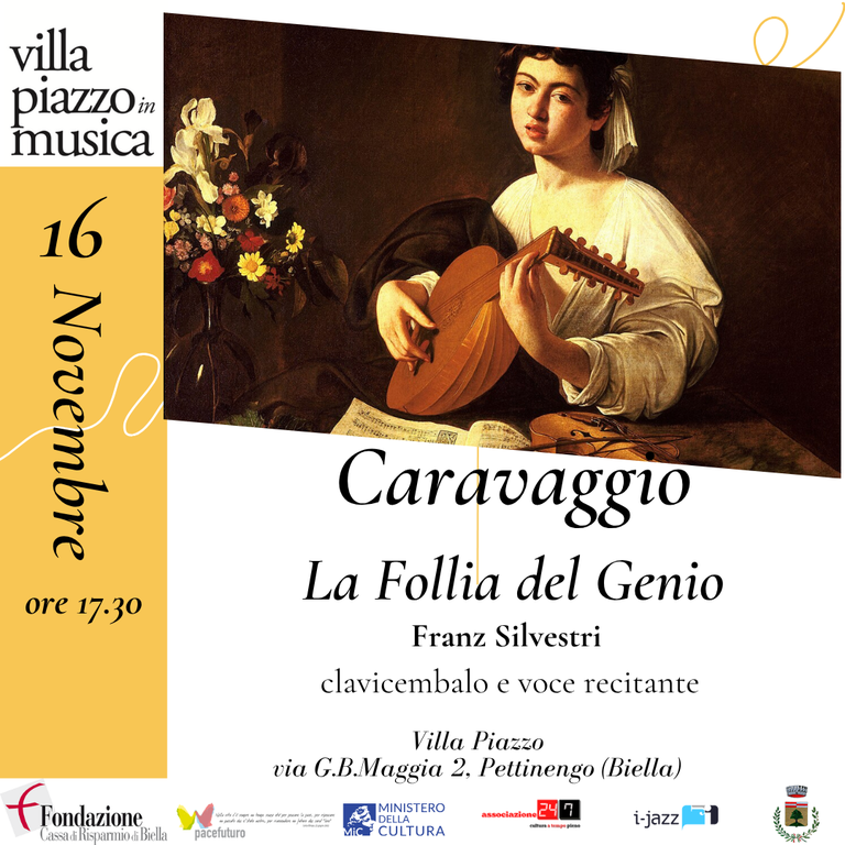Terzo appuntamento con la XIV edizione di Villa Piazzo in Musica, stagione concertistica di Pacefuturo in collaborazione con Musica a Villa Durio, diretta da Massimo Giuseppe Bianchi. Domenica 16 Novembre, alle 17.30, Villa Piazzo di Pettinengo (Biella) ospita “Caravaggio. La Follia del Genio” , un concerto multimediale concepito come l’incontro tra la musica di Bach, suonata al clavicembalo da Franz Silvestri, il racconto visivo della mostra “Caravaggio” e la vicenda esistenziale del pittore, raccontata attraverso le parole dei biografi che ne tramandarono il travaglio e al gloria.