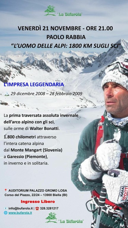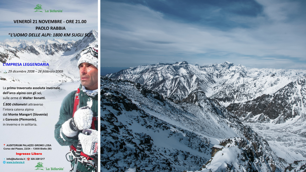 Venerdì 21 novembre alle ore 21.00, presso l’Auditorium Palazzo Gromo Losa di Biella, l’associazione “La Bufarola” presenta l’incontro con Paolo Rabbia, protagonista di un’avventura straordinaria: “L’uomo delle Alpi: 1800 km sugli sci”.