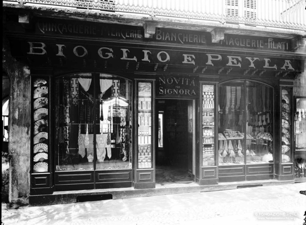 Uno sguardo al passato ci porta nel cuore della Biella di inizio Novecento. La fotografia ritrae la storica bottega “Bioglio e Peyla”, un elegante negozio di merceria e abbigliamento femminile che animava le vie del centro cittadino. Sull’insegna si leggono parole che parlano di un’altra epoca: “Chincaglierie – Mercerie – Biancherie – Maglierie – Filati”.