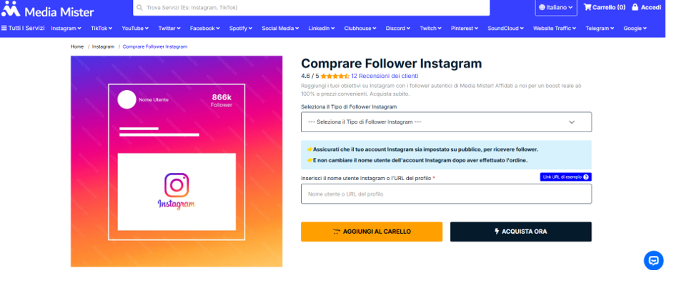 Fondata nel 2012, Media Mister è una delle piattaforme più longeve e affidabili per chi desidera real Instagram follower. La sua reputazione si basa sulla qualità delle interazioni e sulla cura nel processo di consegna. Tutti i follower sono forniti con un sistema di consegna graduale che imita la crescita organica. Questo approccio riduce il rischio di fluttuazioni improvvise e rende il processo più naturale agli occhi dell’algoritmo di Instagram.