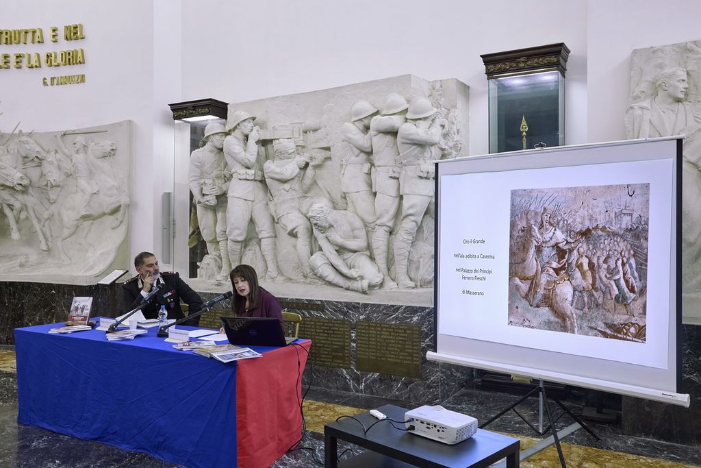 Durante la conferenza, Ghiraldello ha illustrato il percorso storico del volume, partendo dalla ricostruzione del Palazzo dei Principi Ferrero Fieschi di Masserano, sede della caserma dal 1876 e luogo in cui la studiosa aveva scoperto, anni prima, affreschi nascosti da controsoffittature.