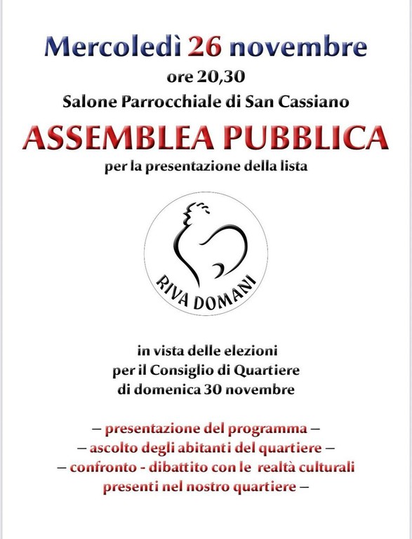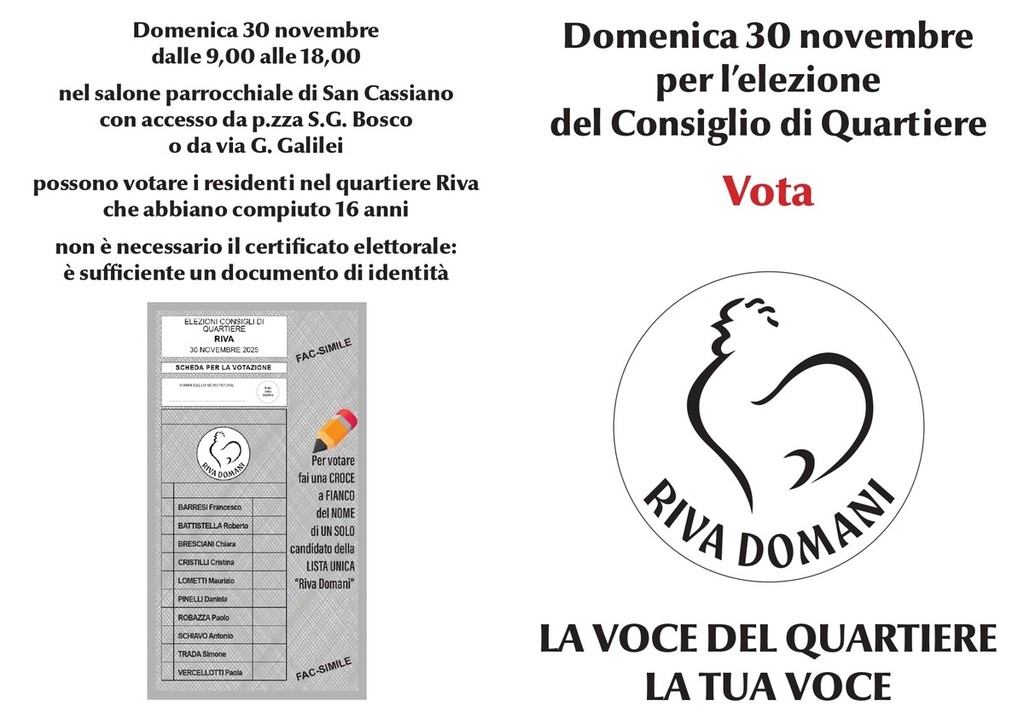 Domenica 30 novembre si terranno le elezioni per la nomina del Consiglio di Quartiere a Biella, e mercoledì 26 in Riva ci sarà un'assemblea pubblica durante la quale si presenterà la lista "Riva Domani".