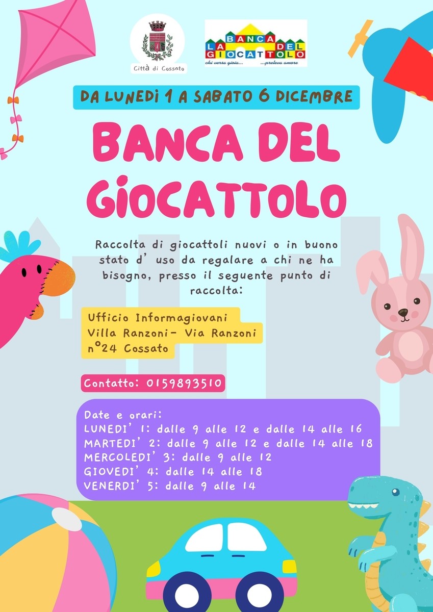 Il Comune di Cossato rinnova anche quest’anno la propria adesione alla Banca del Giocattolo, iniziativa dedicata alla raccolta di giochi nuovi o in ottimo stato da destinare ai bambini di famiglie in difficoltà.