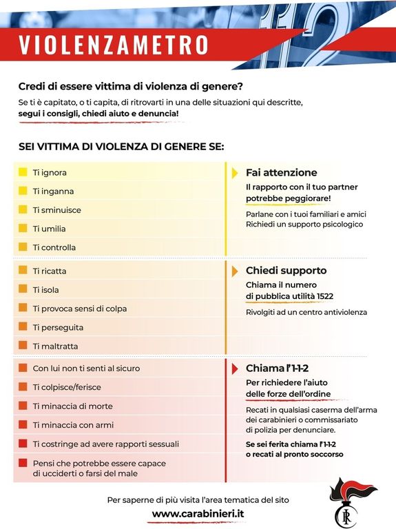 Inoltre, sul sito www.carabinieri.it, è stata dedicata un’intera sezione al “Codice Rosso”, che offre informazioni sul fenomeno e sugli strumenti di tutela delle vittime, mettendo a disposizione un test di autovalutazione, denominato “Violenzametro”, che rileva il livello di violenza subita in un rapporto di coppia (www.carabinieri.it/in-vostro-aiuto/consigli/codice-rosso/codice-rosso).