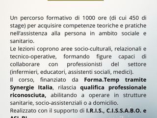 Il corso, che si svolgerà in orario diurno, in modalità part-time verticale (3 giorni a settimana da lunedì a mercoledì), rappresenta un’importante opportunità di inserimento lavorativo: al termine del percorso, e previo conseguimento della qualifica, i partecipanti verranno inseriti in strutture e servizi convenzionati, in linea con i fabbisogni occupazionali del settore.