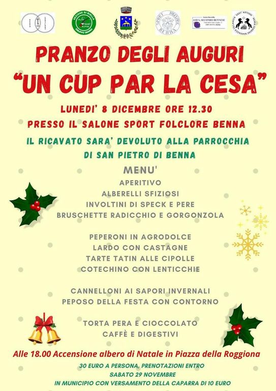 Si avvicina il Natale e la comunità di Benna torna a riunirsi attorno a un appuntamento caro e sentito: il tradizionale Pranzo degli Auguri, in programma l’8 dicembre presso il Salone dello Sport Folclore. L’iniziativa, intitolata “Un Cup par la cesa”, quest’anno assume un valore ancora più profondo: l’intero ricavato sarà devoluto alla Parrocchia di San Pietro.