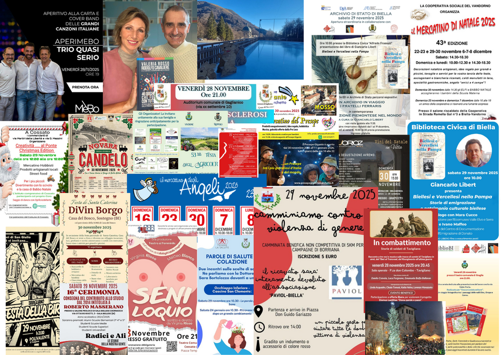 - Biella, Camera del Lavoro, via Lamarmora 4 La città del lavoro - festival di storia. Mostra “Guido Rossa fotografo” fino al 30/01/2026. Sabato 29 novembre ore 18.30 inaugurazione orari di apertura: 1 dicembre 2025 – 30 gennaio 2026 da lunedì a venerdì ore 8.30-12.30 e 14.30-18.30 CHIUSO dal 24 dicembre al 6 gennaio. Ingresso libero.