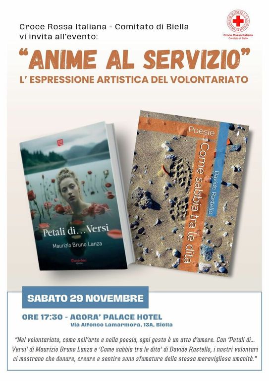 Durante la serata saranno presentate due raccolte poetiche: “Petali di… Versi” di Maurizio Bruno Lanza e “Come sabbia tra le dita” di Davide Rastello. Due opere che, come sottolinea la Croce Rossa Biella, raccontano sensibilità, gesti e sfumature che quotidianamente animano l’impegno dei volontari.