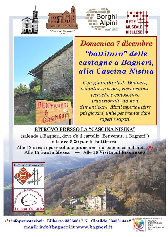 La battitura delle castagne è allo stesso tempo una attività che unisce pratiche agricole tradizionali, aggregazione comunitaria, ritualità di gesti secolari, testimonianza di valori e usanze secolari che si vogliono custodire e tramandare. E’ per questo che gli Amici di Bagneri continuano a raccogliere le castagne, coinvolgendo volontari e abitanti, per essicarle nella tradizionale “graa” per almeno un mese, e quindi arrivare alla giornata della battitura che coinvolge insieme volontari, abitanti, scout, e chi vorrà unirsi per collaborare e partecipare attivamente.