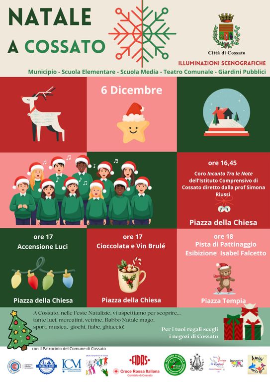 Clima di festa a Cossato per l'arrivo del Natale. Sabato 6 dicembre è in programma un ricco calendario di eventi adatti a tutta la famiglia: si comincia alle 16.45, in piazza della Chiesa, con il Coro Incanto Tra Le Note dell'Istituto Comprensivo di Cossato, diretto dalla professoressa Simona Riussi. Seguirà, alle 17, la cerimonia di accensione delle luci di Natale, con un bicchiere di cioccolata calda o vin brulé.