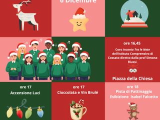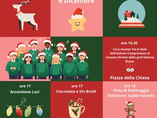 Clima di festa a Cossato per l'arrivo del Natale. Sabato 6 dicembre è in programma un ricco calendario di eventi adatti a tutta la famiglia: si comincia alle 16.45, in piazza della Chiesa, con il Coro Incanto Tra Le Note dell'Istituto Comprensivo di Cossato, diretto dalla professoressa Simona Riussi. Seguirà, alle 17, la cerimonia di accensione delle luci di Natale, con un bicchiere di cioccolata calda o vin brulé.