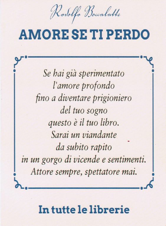 Eppure, c'è in lei qualcosa di misterioso, come di sfuggente, proprio come nel titolo di quest’ultimo libro di Rodolfo Boccalatte: Amore se ti perdo. È questa donna che pensa ad un amore perduto? se così è, ha già superato la sua crisi o il senso è un altro che solo la lettura può rivelare?