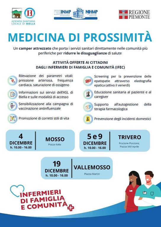 Nell’ambito del Progetto Camper “Cure primarie e territorio: l’Infermiere di Famiglia e Comunità (IFeC) e la medicina di prossimità nell’ASL di Biella”, i giorni 4, 5, 9 e 19 dicembre, dalle 10 alle 16, nelle municipalità di Mosso, Trivero e Valle Mosso, a Valdilana, secondo la calendarizzazione allegata, sarà presente un camper attrezzato che porterà i servizi sanitari direttamente nelle comunità.